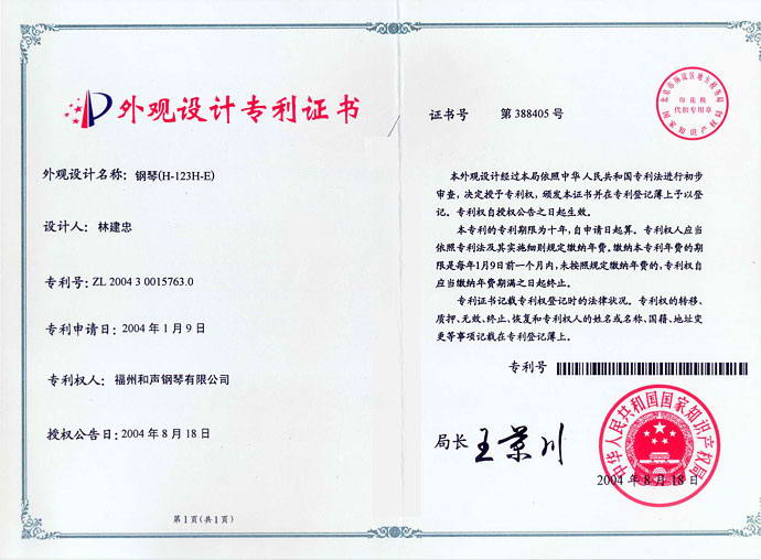 鋼琴(H-123H-E型)(外觀設計專利,專利號:ZL 2004 3 0015763.0) 2018-06-28 09:22:54