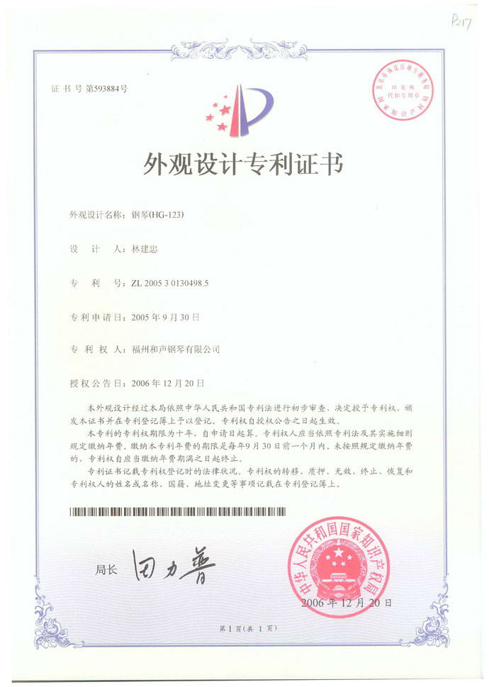 鋼琴(HG-123型)(外觀設計專利,專利號:ZL 2005 3 0130498.5) 2018-06-28 09:23:59