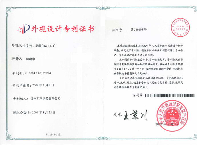 HG-133T;該琴的外觀設(shè)計(jì)簡潔大方,米字形琴背架受力結(jié)構(gòu)合理,為國內(nèi)首創(chuàng)。