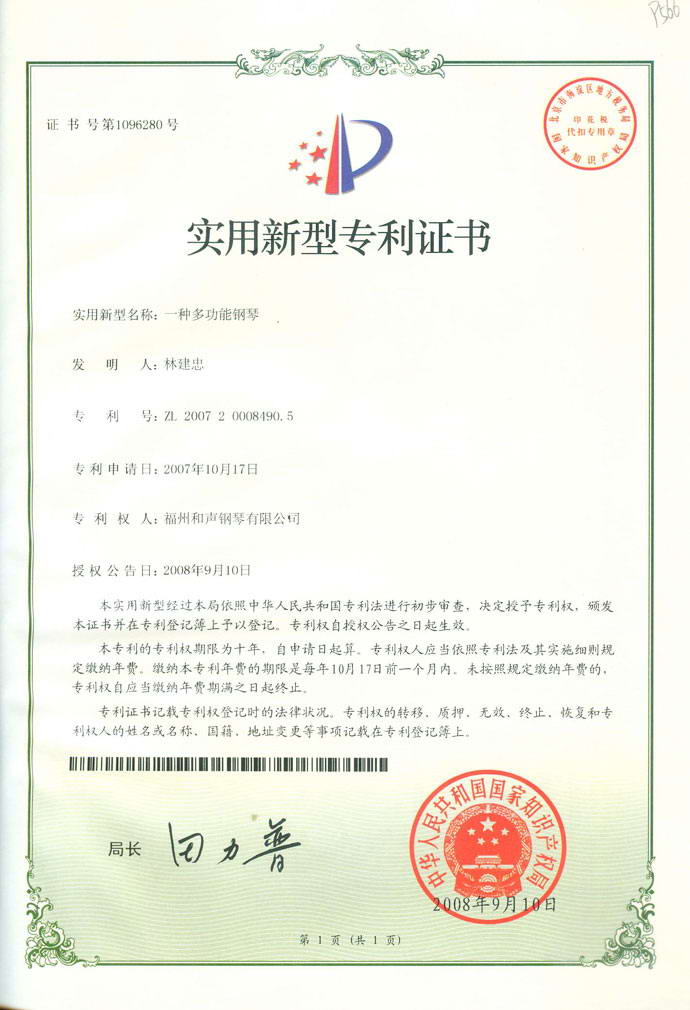 一種多功能鋼琴(實(shí)用新型專利,專利號(hào):ZL 2007 2 0008490.5) 2018-06-28 09:32:42