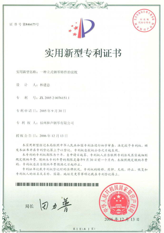 一種立式鋼琴鑄件的鑲嵌式弦枕結構(實用新型專利,專利號:ZL 2005 2 0076151.1) 2018-06-28 10:04:59
